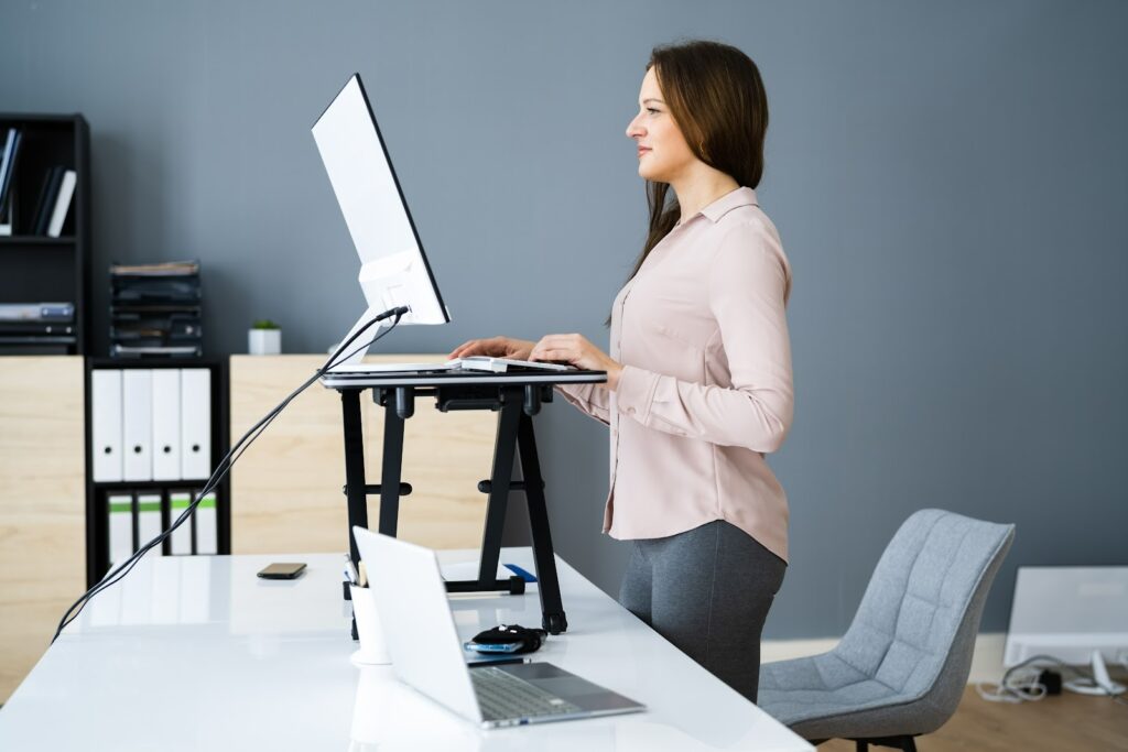 If you’re working at a desk during the data, sit-to-stand desks are great for helping your posture. However, they are not practical for everyone’s needs and budget. One option is a simple ergonomic workstation with an adjustable keyboard tray that moves up and down so the user can stand while working (although this may not be good in some situations).